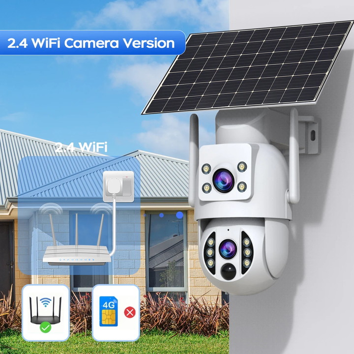 2.4GHz WiFi Connectivity – Stable wireless connection; powered by DC 5V and supports solar charging (solar panel included).